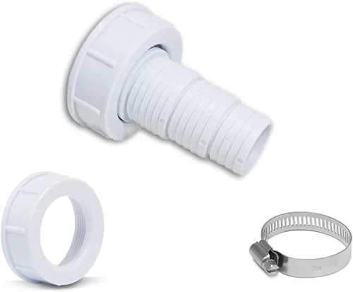 Se conecta de forma segura a Intex y a muchas bombas y tubos de tamaño estándar. Se adapta a mangueras de identificación de 1-1/4", 1-3/8" y 1-1/2". Se adapta a conexiones NPT macho de 1.5" y 2" con tuercas incluidas. El diseño de púas y las abrazaderas de acero inoxidable incluidas garantizan un ajuste apretado en el extremo del tubo. Patente pendiente. No apto para uso con mangueras de jardín o vacío.