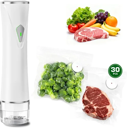 Un botón para la frescura: con un solo botón, este sellador al vacío para alimentos elimina automáticamente el aire en unos 10 segundos. El sellador al vacío es perfecto para conservar rápidamente el pollo para almuerzos semanales o guardar la otra mitad de una cebolla picada antes de que se seque. Estas bolsas selladoras al vacío proporcionan un almacenamiento simple y eficiente que ayuda a mantener la frescura y mantener tu refrigerador organizado Selle en cualquier lugar y guárdelo sin esfuerzo: el diseño compacto de la máquina selladora al vacío funciona con una práctica carga USB, lo que le permite usarla directamente en la encimera de la cocina, en la despensa mientras organiza comestibles o al aire libre junto a la mesa del patio. Después de una carga completa, el sellador de alimentos está diseñado para sellar más de 500 bolsas, lo que permite un uso prolongado. Las bolsas selladoras al vacío para tiendas de alimentos sin esfuerzo en el cajón de tu cocina, manteniendo tus encimeras claras Bloquee la frescura con bolsas duraderas: el diseño de sellado de las bolsas selladoras al vacío contra la pérdida de frescura, ofreciendo una excelente manera de almacenar sus alimentos. Las bolsas selladoras al vacío para alimentos están hechas de material duradero sin BPA que puede soportar temperaturas de -4.0 °F a 212.0 °F, lo que las hace adecuadas para congelar, hervir y limpiar en lavavajillas. Utiliza un sellador al vacío compacto para organizar tu preparación semanal de comidas es una gran opción Kit completo para sus necesidades: este kit de sellado al vacío portátil incluye 30 bolsas reutilizables al vacío, 15 bolsas pequeñas (8.26 x 8.66 pulgadas) y 15 bolsas grandes (10.24 x 11.02 pulgadas). Utiliza el tamaño más pequeño para artículos como queso, sándwiches o frutas en rodajas. El tamaño más grande es ideal para pan, cortes grandes de carne o filetes de pescado. Las bolsas selladoras al vacío están listas para tu preparación semanal de alimentos, organizar artículos de despensa, empacar para picnics Protección del dispositivo y fácil limpieza: el tanque de líquido de la máquina selladora al vacío bloquea eficazmente el agua durante el sellado, lo que le permite manejar carnes marinadas, pescado fresco y frutas jugosas. El componente extraíble del sellador al vacío de alimentos se enjuaga fácilmente bajo el agua, lo que garantiza un mantenimiento simple y fiabilidad a largo plazo para sus tareas de cocina.