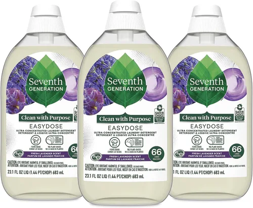Detergente líquido ultra concentrado y muy conveniente: 66 cargas en una botella compacta de 23 onzas que es fácil de almacenar y fácil de sentir bien Nuestra tecnología de dosificación automática Seventh Generation EasyDose mide la cantidad adecuada de detergente, en todo momento. Simplemente gira la botella, aprieta firmemente y listo. ¡Un apretón es todo lo que necesitas! Pequeña dosis, gran limpieza: 60% menos de plástico, 50% menos de agua y 75% más ligero que nuestro detergente líquido de lavandería botella de 100 onzas líquidas Nuestra fórmula avanzada de detergente líquido para ropa combate incluso las manchas más difíciles Aroma refrescante de lavanda hecho de ingredientes reales: aceites esenciales 100% e ingredientes botánicos en nuestro detergente de lavado Detergente concentrado para ropa hecho con tintes al 0%, fragancias sintéticas o abrillantadores artificiales