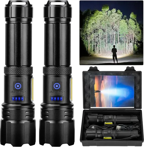 Linterna de alto lúmenes. La linterna recargable Sigoobal es una potente linterna de mano con 7 modos de luz. La linterna LED puede iluminar un máximo de 3280 pies, y luego la vida útil es de más de 120,000 horas. Adecuado para acampar, senderismo, correr por la noche, pescar, escalar, cazar y otras actividades al aire libre Recargable por USB y pantalla de alimentación. Linterna recargable equipada con gran capacidad recargable BATTERY, se puede iluminar continuamente durante 15 horas cuando está completamente cargada. Además, la luz LED de visualización de potencia de la linterna te permite conocer el estado de energía de las linternas de mano en tiempo real Linterna ajustable. Esta linterna LED puede cambiar el modo de luz retrayendo el cabezal de la lámpara. Puede cambiar la iluminación que necesita luz para adaptarse a diferentes entornos. También es una buena linterna de camping, la mejor opción para senderismo, pesca u objetivos de búsqueda IPX6 resistente al agua y materiales de alta calidad. Equipado con tecnología impermeable IPX6, es fácil de usar incluso en días de lluvia fuerte o nieve. El cuerpo hecho de la potente linterna está hecho de aleación de aluminio de aviación de alta calidad, tiene resistencia al impacto y es robusto 7 modos de luz. La linterna LED tiene 3 modos de luz principales: (alto, medio, estroboscópico) y 4 modos de luces laterales (alto, medio, luz roja, luz intermitente roja). Pulsa rápidamente el botón de encendido/apagado dos veces para cambiar a los modos de luces laterales, un diseño de apagado de tecla se puede apagar directamente en cualquier modo a través del botón de presión prolongada 2 segundos, sin necesidad de pasar por todos los modos. Adecuado para senderismo, campamento y caza, también se puede utilizar como luz de trabajo o luz de advertencia en caso de emergencia