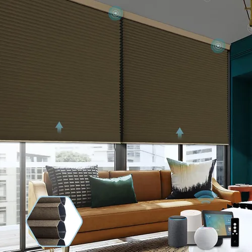 Motor inteligente: Las baterías recargables con múltiples motores están disponibles: El motor estándar se puede controlar por control remoto, con la función de control inalámbrico más básica. El motor Zigbee se puede conectar directamente con Alexa de 5 versiones. Echo Plus de 2ª generación, Echo Show de 2ª generación, Echo Studio, Echo Show 10, Echo 4ª generación. Matter Motor se puede utilizar a través de hilo o Bluetooth para ser compatible con dispositivos inteligentes Homekit, Alexa, Google. Los motores de onda Z se pueden conectar al concentrador Z-wave para su uso con otros dispositivos. Apagón completo: esta persiana celular motorizada está hecha de tela opaca de nido de abeja de una sola capa de 1.1 pulgadas y papel de aluminio. El papel de aluminio está unido dentro de cada compartimento de panal para evitar completamente que la luz brille a través de la tela y en la habitación. Cuando bajes la sombra de panal por completo, ninguna luz exterior ni ojos podrán penetrar en tu ventana, adecuado para salas de medios, guarderías y dormitorios. Aislamiento e insonorización: Las persianas automáticas de panal proporcionan una buena absorción de sonido y también evitan la pérdida o elevación innecesaria de la temperatura. El diseño uniforme de la parte trasera blanca refleja la luz solar y reduce la absorción de calor. La estructura única de panal también bloquea el intercambio de calor entre el interior y el exterior y reduce los efectos nocivos de los rayos ultravioleta. Mientras tanto, la capa de papel de aluminio en el interior de la tela puede reflejar aún más el calor. Seguridad y belleza: la estructura única de panal podría mejorar la forma de su ventana y difundir eficazmente la luz. Cuando la luz es capturada de la manera más hermosa, se crea una sensación de comodidad pura que proporciona una comodidad extraordinaria en toda su casa. El diseño inalámbrico mejora la seguridad de los hogares con tu familia al eliminar los cables de tracción. Las características fáciles de controlar harán que tu vida sea más elegante. Hecho por encargo: nuestras persianas celulares motorizadas personalizadas tienen el tamaño para adaptarse a sus ventanas. Haga clic en "Personalizar ahora" para especificar las dimensiones y detalles de las persianas motorizadas que mejor se adapten a sus necesidades. Ofrecemos accesorios adicionales como paneles solares, Smart Link y más para mayor comodidad. Seleccione diferentes motores para que coincidan con su hogar inteligente y mejore su experiencia de hogar inteligente. Proporcionaremos el servicio personalizado más profesional.