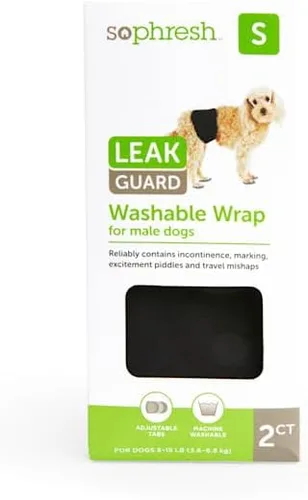 Envoltura protectora de fugas lavable para perros machos de So Phresh Incluye dos envolturas para perros machos lavables a máquina Se puede utilizar para contener y reducir las marcas de perros en casa Disponible en tres tamaños con pestañas ajustables, por lo que puedes encontrar el ajuste perfecto para tu cachorro Contiene accidentes con un forro que absorbe la humedad, almohadillas de microfibra súper absorbentes, una barrera a prueba de fugas y tela exterior de secado rápido