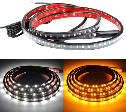 【Paquete de 2】 Tira de luz LED flexible de 60 pulgadas para estribo, viene con cinta de doble cara en la parte posterior y 6.5 pies de cableado en cada tira. 【Superbrillante】La tira LED está alimentada por 144 SMD 2835, 72 chips LED blancos para puerta, paso, DRL, luces de estacionamiento y 72 LED ámbar para luces intermitentes secuenciales. 【Impermeable】Diseño de tira LED IP67 para condiciones climáticas adversas, funciona como luz de bienvenida LED de cortesía para la puerta y luces de señal de giro con secuencia. 【Fácil de instalar】¡No se necesita perforar un agujero! Simplemente retira la cinta adhesiva de doble cara en la parte posterior y aplícala a tu ubicación deseada (asegúrate de limpiar la superficie antes). Sin complicaciones 45 días de devolución para reembolso o reemplazo más 1 año de garantía sin preocupaciones.