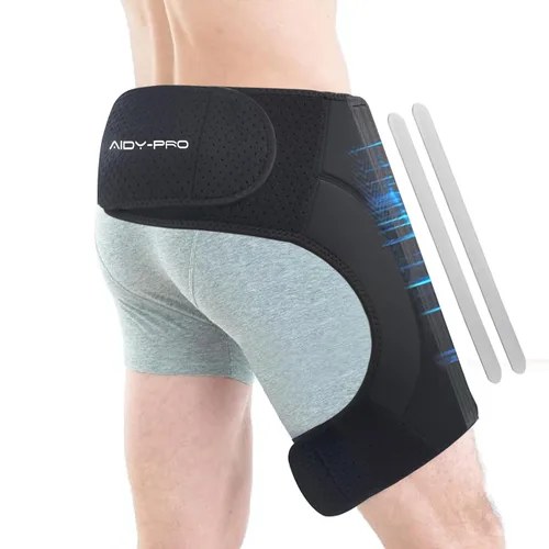 Alivio del dolor específico: la abrazadera de muslo AIDY-PRO tiene 2 barras de soporte de metal extraíbles en un lado del muslo para estabilizar la articulación de la cadera y los músculos circundantes. Está especialmente diseñado para ofrecer apoyo para lesiones de cadera, ingle, isquiotibiales y muslos. Una opción ideal para reducir la inflamación y aliviar las molestias causadas por la ciática, artritis, distensiones musculares y bursitis de cadera. Compresión y ajuste ajustables: las correas de velcro en la cintura y el muslo permiten un fácil ajuste de la tensión para un ajuste personalizado. Diseñado para adaptarse tanto a la pierna izquierda como a la derecha. Fácil de llevar y ajustar: nuestro soporte de cadera para mujeres y hombres se puede llevar todo el día, durante el trabajo diario, el ejercicio o el descanso. Es fácil de poner y ajustar, y se puede llevar sobre o debajo de la ropa sin restringir tu rango de movimiento. Cómodo y transpirable: hecho de tela de primera calidad resistente al desgaste para una mayor durabilidad y comodidad. El soporte de muslo cuenta con un diseño perforado para mejorar la transpirabilidad, absorbe el sudor y reduce la irritación de la piel. Unisex y talla única: el soporte flexor de cadera es adecuado tanto para hombres como para mujeres. Se adapta cómodamente a tamaños de cintura de hasta 43 pulgadas (43.3 in) y tamaños de muslo de hasta 27 pulgadas (27.6 in), por lo que es una opción versátil para el hogar, gimnasio o lugar de trabajo.
