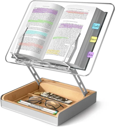 【Conveniencia de almacenamiento】La caja de almacenamiento integrada mantiene los marcadores, bolígrafos y gafas al alcance, asegurando una lectura sin interrupciones con las manos libres y una mejor organización del escritorio. Soporte estable: los brazos de metal reforzado sostienen los libros de forma segura en el soporte para libros, evitando resbalones o flacidez inesperados durante las sesiones de lectura o estudio. 【Diseño Versátil】Soporte acrílico para libros con superficie transparente (13.4×9.5") sostiene libros de cocina, partituras, cuadernos o MacBooks para lectura o estudio sin usar las manos. Almacenamiento protector: la caja moldeada de corcho suave amortigua artículos almacenados como marcadores y gafas, manteniéndolos seguros dentro del soporte del libro y a salvo de daños por impactos. Diseño que ahorra espacio: este soporte plegable para libros minimiza el espacio de almacenamiento, por lo que es ideal para estantes de libros pequeños, escritorios compactos o áreas de lectura limitadas. 【Comodidad sin manos】Comodidad mejorada para la lectura – Diseñado para amantes de los libros y clubes de lectura, este soporte para libros permite la lectura con manos libres, reduciendo la fatiga de las manos y manteniendo los elementos esenciales al alcance. 【Soporte confiable】Damos prioridad al servicio posventa receptivo con soporte las 24 horas, asegurando soluciones óptimas para tus necesidades de soporte para libros y soporte de lectura.