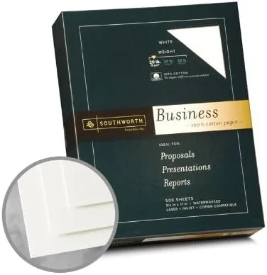 Southworth Business and Legal - Papel blanco 100% algodón, 8 12 x 11 pulgadas, 20 libras, tejido de bono 100% algodón, marca de agua, 500 por resma
