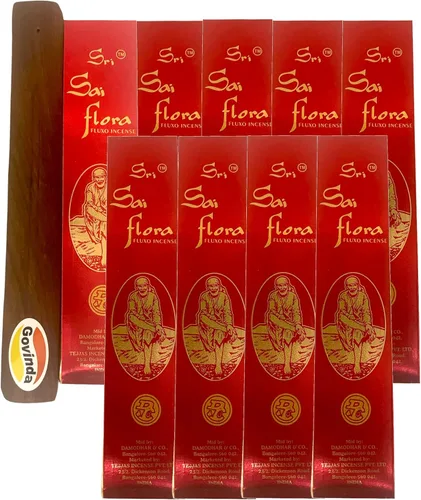 Sri Sai Flora Fluxo Incienso 9 paquetes de 0.88 oz y paquete de soporte El soporte para incienso Govinda está hecho de madera real. Sri Sai Flora está especialmente formulado para adorar a Dios, aromatizar los cuartos de vida y crear un ambiente tranquilo para las actividades cotidianas