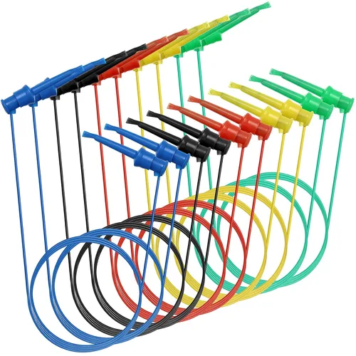 ¿Por qué necesitas nuestros clips de gancho de prueba? 1. Estos clips de prueba de cables de plomo están hechos de material de silicona de alta calidad, La silicona puede ayudar con la longevidad y fácil de usar. 2. Tienen 5 variedad de colores(rojo, verde, blanco, negro y amarillo). Por lo tanto, no agarrará el clip incorrecto al probar y cambiar las ubicaciones en el circuito, y disfruta de la comodidad y practicidad de estos clips de puente muy útiles. 3. Los cables de prueba se pueden utilizar en trabajos de pruebas eléctricas o de laboratorio eléctrico. 4. Las pinzas de gancho de prueba se utilizan con frecuencia en los laboratorios de física escolar para montar circuitos de forma rápida y económica. Son útiles para conectar componentes a cables. 5. No importa si estás tratando de hacer algunas conexiones rápidas para probar tu circuito o tienes problemas para que tus cables de multímetro permanezcan donde los necesitas. Estos clips con resorte son imprescindibles para tu taller. Información sobre el tamaño: Longitud total del cable: 59 cm; Longitud del gancho de prueba: 5.5 cm; Longitud máxima de apertura del gancho: 5 mm. Material del cable: Silicona Material del clip: cobre Aplicación: Pruebas de baja corriente, proyectos eléctricos ligeros, aplicaciones, electrónica, placas de circuito, etc. El paquete incluye: 10 x clips de gancho de prueba coloridos