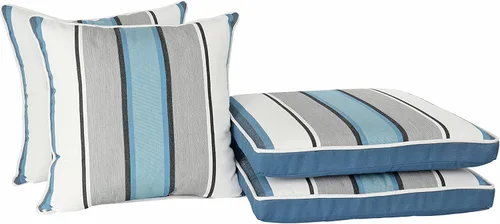 Juego de cojín y almohada de lujo para asiento de comedor de 4 piezas: complemento perfecto para cualquier espacio de salón al aire libre y mejora instantáneamente la configuración actual de tus muebles de patio Tejido resistente a la decoloración: hecho de hilos de poliéster duraderos teñidos en solución que están protegidos contra los rayos UV y resistentes a la decoloración para un color vibrante Relleno de fibra de poliéster: los cojines de asiento están rellenos con fibra de poliéster 100% densificada y las almohadas están rellenas de poliéster soplado para un apoyo suave a medio Diseño versátil: patrón clásico de rayas azules con parte trasera azul sólido que combina con cualquier decoración Tamaño ideal: incluye 2 cojines de asiento con lazos de aproximadamente 19 x 19 x 2 pulgadas cada uno y 2 almohadas de aproximadamente 19 x 19 pulgadas cada uno (puede variar hasta 2 pulgadas ya que el artículo está hecho a mano)