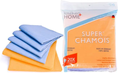Super Chamois es un paño de limpieza de gamuza sintética fabricado en Alemania fabricado con una tecnología especial de hilado por aire que crea una gamuza súper absorbente, fuerte, suave y sin pelusas. Este proceso único de hilado al aire crea miles de poros diminutos (similar a una esponja muy, muy fina) que permiten que cada paño absorba y mantenga más de 10 veces su peso en líquido. La gamuza Super se puede utilizar en húmedo o seco para cientos de usos en interiores y exteriores, incluyendo: derrames, automóviles, barcos, caravanas, alfombras, ventanas y espejos, azulejos, cerámica, madera dura, mármol, granito, metal pulido, duchas, derrames de refrigerador, descongelación por congelador, ropa, mascotas y otras necesidades del hogar. La gamuza súper es lavable a máquina, reutilizable, respetuosa con el medio ambiente y se puede cortar para satisfacer tus necesidades personalizadas. La gamuza súper no rayará las superficies y durará años.