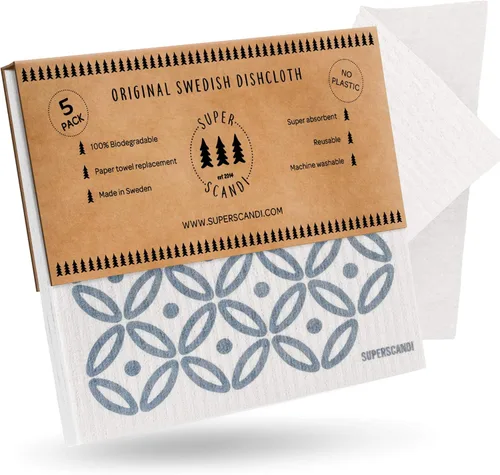 Paquete de 5 paños suecos estampados de SUPERSCANDI Nuestros paños para lavar platos tienen la funcionalidad de una esponja de celulosa que actúa como toallas de alta absorción con una durabilidad de hasta 25 rollos de toallas de papel. Más versátiles que un paño de limpieza de microfibra, son perfectos para limpiar superficies, como ropa de cocina para lavar platos y limpiar derrames, así como para usar en el baño, mascotas, automóvil, jardín y oficina. 🌱 Agradable al medio ambiente. Sin productos químicos, sin vertederos. Hecho de materiales naturales y sostenibles, 30% algodón, 70% pulpa de madera de celulosa biodegradable de bosques suecos y compostable. Nuestros paños suecos para cocina son perfectos tanto para tu hogar como para el planeta. Fácil de usar: lavable, de secado rápido y sin olor maloliente. Nuestros paños europeos se pueden lavar hasta 50 veces en el lavavajillas o lavadora. Súper absorbente, absorbiendo 20 veces más líquido que su peso ✨ Excelente diseño de estilo escandinavo: nuestra marca sueca tiene un borde escandinavo fuerte y fresco, por lo que es el regalo perfecto para los amantes del interior y aquellos apasionados por el medio ambiente. Con un paquete limpio y llamativo y colores únicos y modernos, nuestro paño de celulosa complementará tu hogar. Calidad premium y diseño moderno: la colección de telas Superscandi añade un toque elegante a tu cocina y hogar. No solo se ven geniales, sino que también son ecológicos, sin olores y proporcionan resultados de limpieza profesionales.