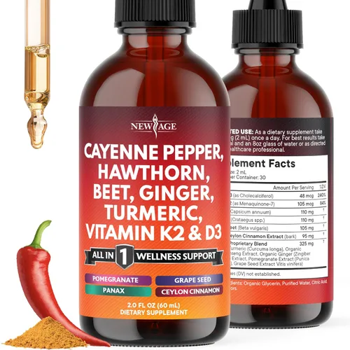 Suplemento de pimienta de cayena en gotas líquidas + bayas de espino, vitamina D3 K2 polvo de raíz de remolacha, canela de Ceilán, curcumina de