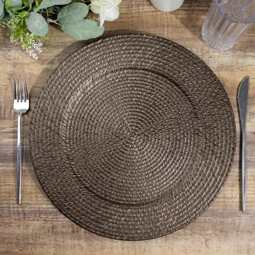 Tableclothsfactory Paquete de 6 platos de carga de plástico acrílico marrón natural de 13 pulgadas tipo ratán, platos redondos desechables