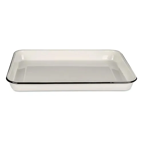 Aporta encanto vintage y rendimiento moderno a tu cocina con esta bandeja esmaltada TableCraft 80012. Parte de la colección Enamelware, este molde para hornear esmaltado de 16 pulgadas está hecho de esmalte de porcelana vítrea duradero sobre acero, ofreciendo un rendimiento térmico confiable de hasta 572 °F. Utilízalo como una bandeja de galletas de esmalte, fuente para hornear de esmalte o plato de esmalte para asar verduras, nachos crujientes o servir ensaladas mediterráneas. El borde de 1.5 pulgadas lo hace ideal para colocar en capas de mariscos sobre hielo o llevar bebidas al aire libre, por lo que es una adición versátil a tu línea de esmaltes y servidores. Ya sea que estés cocinando, sirviendo u organizando, esta bandeja de esmalte pasa sin problemas del horno a la mesa. El acabado blanco sólido con borde negro añade un toque retro clásico a cualquier entorno, mientras que la construcción resistente soporta el uso diario. Apta para lavavajillas y lista para inducción, esta bandeja para hornear esmaltada es perfecta tanto para uso en interiores como exteriores. Desde moldes para hornear esmaltados y platos de esmalte hasta bandejas de esmalte y almacenamiento de esmalte, este TableCraft 80012 ofrece función, estilo y posibilidades infinitas en una sartén esmaltada atemporal. Detalles del artículo: Esmalte (esmalte de porcelana vítrea sobre acero) Apto para lavavajillas. Uso en exteriores o interiores. Horno a mesa Apta para llama y congelador. Listo para inducción Resistente al calor hasta 572°F | 572.0 °F No apto para microondas