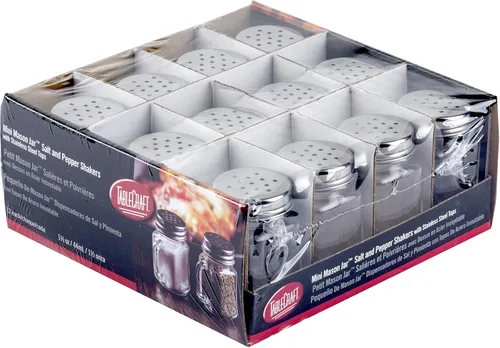 El mini salero y pimentero Tablecraft con parte superior de acero inoxidable, 12 por paquete, 1.5 onzas es justo el tipo de mesa esencial que añadirá un toque de sabor a tu gran día. Tablecraft Mini salero y pimentero Mason con parte superior de acero inoxidable, 12 por paquete incluye doce recipientes de 1.5 onzas que tienen forma de tarros de cristal en miniatura. Estos mini saleros y pimenteros vienen con una parte superior de acero inoxidable para mantener tu mesa libre de derrames. ¡Doce pequeños agitadores en forma de recipiente por paquete! ¡Mantén tu comida con un buen sabor durante horas! Este juego viene con 12 mini cocteleras de cristal en una caja de regalo de lujo. 8 especias vienen en cada paquete surtido: pimienta negra, ajo en polvo, sal de apio, pimienta chipotle, pimienta de limón y más. Cada pequeño frasco tiene una cubierta protectora de plástico sobre la abertura de la boquilla del vertedor para limpieza y protección contra derrames accidentales.