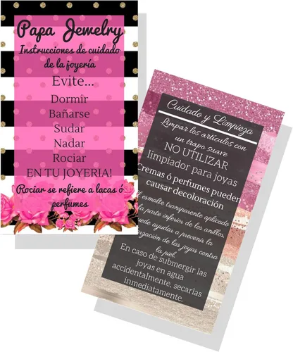Pregunta sugerida sobre Tarjetas españolas de limpieza y cuidado de joyas Paquete de 50 Instrucciones de cuidado de Jewelry Bling Queen en español Rayas con diseño floral ¿Este producto sí me sirve para lo que necesito?