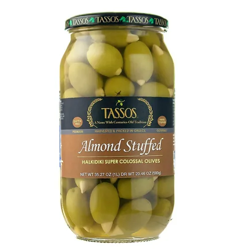 These super colossal Halkidiki Greek olives -- hand-stuffed with whole California almonds -- are bursting with a natural, unique flavor. They are always ready for a party, a charcuterie board, an afternoon snack, or an evening in front of the TV. Tassos Almond Stuffed Greek Olives are inspected twice to ensure their quality and size. Our Almonds are grown in California. All natural, without any chemicals or artificial coloring. Tassos Olives are pasteurized and certified pesticide-free.