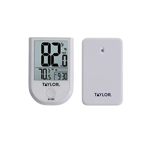 El termómetro inalámbrico Taylor para interiores y exteriores monitorea con precisión las temperaturas en F ° y C. Elegante y contemporáneo, este termómetro inalámbrico muestra dígitos extra grandes para una mejor legibilidad y lecturas diarias de temperatura mínima y máxima. Transmitiendo hasta 200 pies de distancia, el control remoto inalámbrico garantiza que nunca estarás lejos de comprobar el clima en la comodidad de tu hogar.