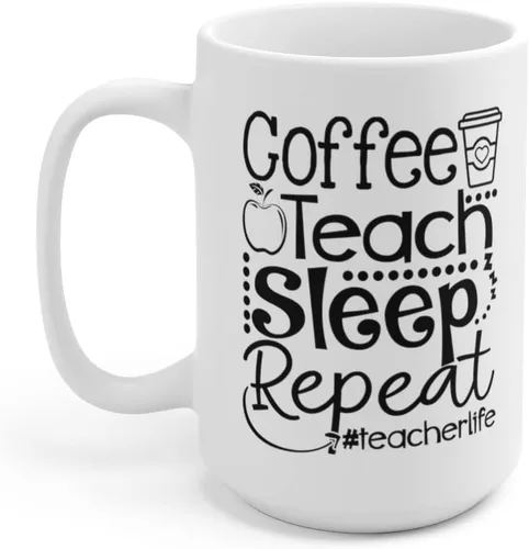 Teacher Gift, Coffee Teach Sleep Repeat Coffee Mug, Teacher Life, Gift for Teachers, Teacher Appreciation (15 oz All White)