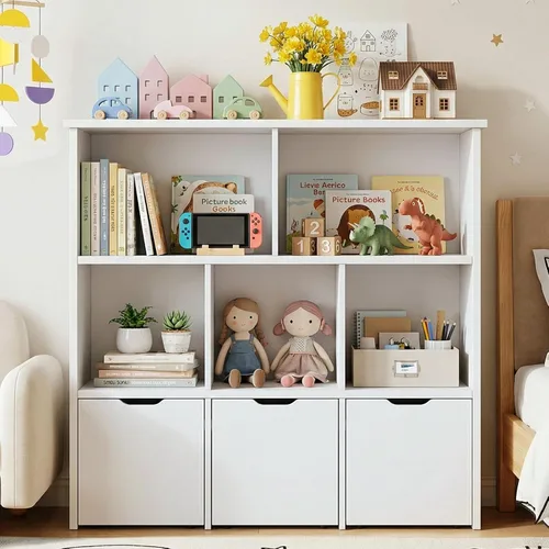 【2-in-1 Toy Storage and Bookshelf】This toy organizer and kids bookshelf features a 2-in-1 design that serves as both a toy storage organizer and a bookcase for toddlers and kids, perfect for playroom, nursery, bedroom, or living room, it encourages children to develop good tidying habits while keeping playtime fun and organized 【Ample Storage for Various Needs】This kids storage cabinet offers 5 open cubbies, perfect for displaying books, dolls, and art supplies, plus 3 movable drawers with hidden wheels for tucking away blocks, puzzles, plush toys, and craft materials, and the spacious top is ideal for a clock, nightlight, or picture frame, making it a perfect toy storage with drawers for small spaces 【Easy for Little Hands to Use】The 3 movable drawers glide smoothly on hidden wheels, so even small children can pull them open and push them back without frustration, and the 5 open cubbies put books and toys at eye level, making it easy for kids to see, reach, and put things away on their own, building confidence and independence every day 【Safe Design & Easy Assembly】This toy storage cabinet is designed with child safety in mind, featuring smooth edges and an anti-tip anchor kit to prevent accidents, and clear illustrated instructions with labeled parts make assembly quick and hassle-free 【Versatile for Any Room – Perfect Gift Idea】Whether you need a toy storage shelf for the playroom, a kids bookcase for the nursery, or a storage cabinet for the living room or hallway, this toy storage organizer fits seamlessly into any space, making it a perfect gift for birthdays, holidays, or any special occasion, helping children develop reading habits and organizational skills while keeping rooms clutter-free