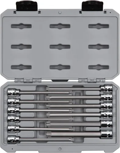 Incluye 12 unidades. 3/8 pulg. enchufe de bits Torx largos: T10, T15, T20, T25, T27, T30, T40, T45, T47, T50, T55, T60; Estuche de transporte La broca de acero S2 se ajusta a presión en el enchufe para una conexión recta y permanente que no se puede aflojar con el tiempo La broca Torx en forma de estrella tiene 6 lóbulos mecanizados con tolerancias precisas para un ajuste exacto y de alto par que resiste el deslizamiento Las puntas extralargas te permiten llegar profundamente a zonas especialmente estrechas y empotradas El marcado de tamaño grande y transparente es fácil de leer y no se desgasta Cuatro ranuras de retención proporcionan una conexión segura con la herramienta de accionamiento Acabado pulido y cromado fácil de limpiar y altamente resistente a la corrosión Los enchufes vienen organizados en una funda resistente que cuenta con cierres fuertes y marcas claras y moldeadas para cada herramienta