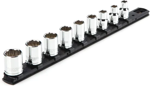 Incluye 9 piezas. 3/8 pulg Drive 12 puntos de zócalos: 5/16, 11/32, 3/8, 7/16, 1/2, 9/16, 5/8, 11/16, 3/4 pulgadas. ; Riel del zó Apertura de 12 puntos para cierres hexagonales dobles (12 lados), hexagonales y cuadrados La geometría del zócalo está diseñada para aplicar fuerza a los lados planos de los sujetadores y no a las esquinas, evitando el redondeo El zócalo de longitud estándar es relativamente versátil y adecuado para una amplia gama de aplicaciones Las marcas de tamaño extra grandes son fáciles de leer y no pueden desgastarse