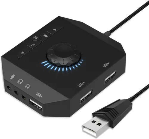 Adaptador de audio de concentrador USB Expander: 3 puertos USB 2.0 que te permiten conectar dispositivos Multi USB; 3 puertos de audio de 0.138 in para auriculares, auriculares, altavoces, micrófono. Múltiples puertos se pueden conectar al mismo tiempo, no se requieren adaptadores adicionales Hub USB con tarjeta de sonido: la tarjeta de sonido externa con un chip de audio es ideal para reemplazar su tarjeta de puerto de sonido o audio defectuosa. Ideal para Skype, ICQ, Google Hangouts, TeamSpeak, también es adecuado como segunda fuente para el funcionamiento simultáneo de altavoces y auriculares Más fuerte y efecto de audio: con botón de control de volumen te permite ajustar el volumen directamente; con el botón EQ puede cambiar a diferentes efectos de sonido según sea necesario para tener una mejor experiencia, aumentando el nivel de audio del juego, música o películas de audio. Evita interferencias electromagnéticas y goza de una calidad de sonido estable y óptima. Comodidad de uso: compatible con la función de intercambio en caliente Plug and Play, no se requieren controladores; longitud del cable 3.93 pies (47.2 in), se puede conectar a la parte posterior de la computadora de escritorio y coloca el concentrador de audio USB en la parte superior del escritorio. Amplias aplicaciones: compatible con dispositivos de 0.138 in como auriculares, altavoces, auriculares o micrófono; funciona para PC, laptop, etc. como teclado, ratón, lector de tarjetas, disco duro, disco USB, cámara web, reproductores de mp3, etc.; Compatible con PC/portátil/escritorio; Compatible con Windows XP, 7, 8, 8.1, 10