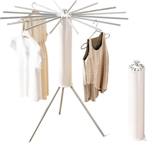 1. Strong Air-Drying Power with 16 Extended Arms Designed for fast, efficient air-drying, this tripod rack opens into a wide umbrella shape with 16 extended wooden arms, giving every item better airflow. Perfect for shirts, towels, delicates and daily laundry without crowding. 2. Stable Tripod Base—No Wobbling or Tilting Built with a reinforced three-leg structure, the rack stands firmly even when fully loaded. Whether you hang heavy jeans or multiple shirts, it remains steady without tipping over like cheaper plastic racks. 3. Premium Beechwood + Rust-Free Materials for Long-Term Use Made from solid beechwood poles combined with durable rust-free hardware, this rack provides long-lasting strength and a clean, natural look. Unlike metal racks that rust or plastic racks that bend, this one stays sturdy and smooth. 4. Fully Foldable & Easy to Store in Seconds Open it with a simple step-pedal — fold it down just as quickly. The slim, compact profile fits easily behind doors, in closets, or next to the washer. Ideal for apartments, laundry rooms, dorms, RVs, and small spaces. 5. Indoor & Outdoor Versatile Drying Lightweight enough to move around your home, yet strong enough for outdoor use. Dry clothes in the bathroom, bedroom, balcony, patio, or even on camping trips. A perfect everyday laundry helper for any household.