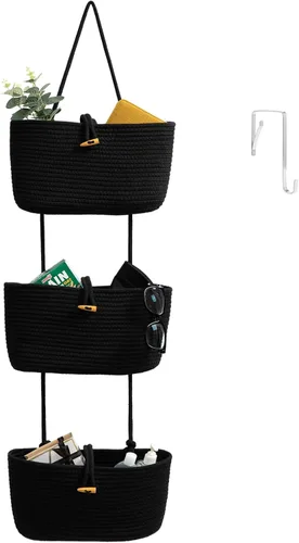 TeoKJ Cestas colgantes sobre la puerta con correa de botón, bolsa organizadora de almacenamiento de algodón tejido de 3 niveles, montadas en la