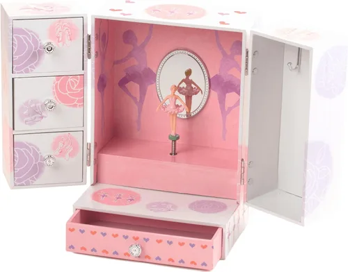 Reproduce melodía: "Swan Lake". Movimiento de 18 notas Mide 8.25 pulgadas de alto Cuenta con puertas con bisagras que se abren para guardar tus joyas Tiene hermosos detalles de bailarina, flores y corazón La bailarina gira delante del espejo cuando la caja se abre y se enrolla.