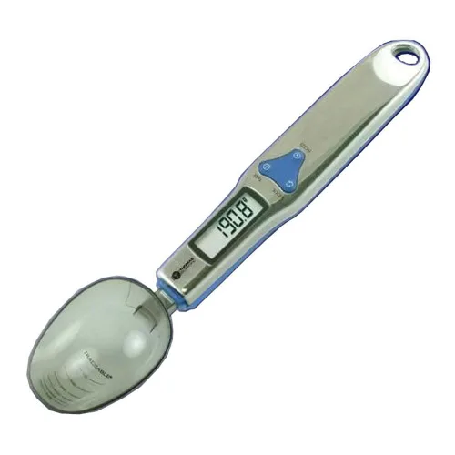 Pantalla digital Mango de fácil agarre La cuchara grande minimiza el derrame La precisión es +/-0.01 oz o 0.25 por ciento lo que sea mayor Mide 9 pulgadas de largo por 2 pulgadas de ancho por 1 pulgada de grosor