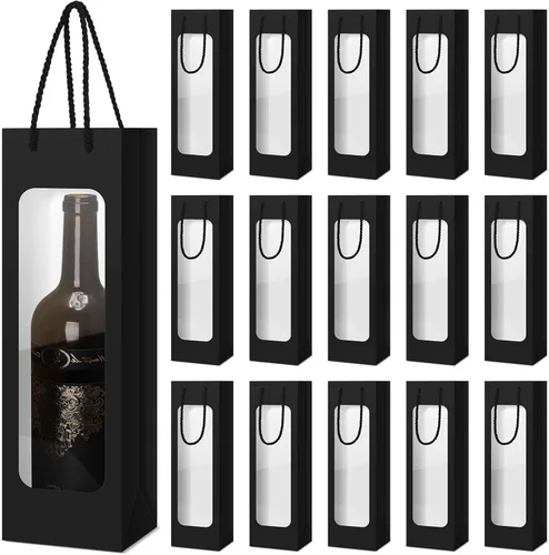 Material de calidad: las bolsas de regalo para botellas de vino están fabricadas con material kraft de calidad duradera, asegurando que la bolsa no sea fácil de rasgar o romper; La calidad del material permite un uso confiable y duradero, manteniendo bien protegida cada botella de vino durante el transporte y dando Diseño simple y elegante: nuestras bolsas de regalo de vino están diseñadas en un color negro clásico y elegante, seguro que añadirán un toque de sofisticación a tu regalo; el color es neutro, por lo que son adecuadas tanto para hombres como para mujeres y agradables para la mayoría de las ocasiones, ya sea un cumpleaños, aniversario o vacaciones de Navidad El paquete incluye: recibirás un generoso paquete de 24 piezas de bolsas de regalo negras con asas, cada una mide aproximadamente 12.5 x 8.5 x 36 cm / 4.92 x 3.35 x 14.2 pulgadas, están diseñadas para acomodar la mayoría de los tamaños de botellas de vino Característica de ventana transparente: la ventana transparente de nuestras bolsas negras con asas que se presenta en el diseño proporciona una visión de la botella de vino que estás regalando, lo que puede facilitarte identificar lo que está almacenado en ella, brindándote una experiencia de uso cómoda Amplias aplicaciones: nuestras bolsas de regalo de vino para botellas de vino no solo pueden contener botellas de vino, sino también otros objetos pequeños, dándote otra forma de usarlas; El diseño simple y hermoso puede mostrar la belleza de tu regalo, y también puedes compartir nuestras bolsas de regalo con familiares, amigos y colegas para transmitir tu cuidado