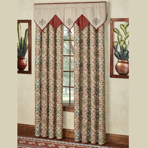 La cenefa Ascot en capas irradia un encanto rústico del suroeste Bordado con medallones inspirados en el suroeste Capas de ascot de color natural y tonos cinabro Acentuado con lazos en los extremos Mide 60 pulgadas de ancho x 18 pulgadas de largo