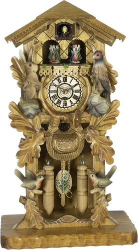 Color: Nogal Dial, las manecillas y los pesos son de madera. El reloj reproduce 12 melodías. Las melodías son: Happy Wanderer, Edelweiss, Dr. Zhivago, Swan Lake, Él era hermoso, Lorelei, Hogar dulce hogar, Sonido del silencio, Clementina, El artista, Amor tema de la película, Para Elise. El reloj necesita tres pilas C bebé y una pila AA mignon. Cuco llama a la hora con eco. El reloj tiene un movimiento operado por batería con apagado automático nocturno. El tiempo de funcionamiento de las baterías es de aproximadamente un año. El tamaño se refiere solo al reloj, sin péndulo y pesos. 2 años de garantía del producto. El reloj está hecho de madera.
