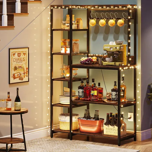 • Prácticas tomas de corriente: ¿Necesitas siempre tiras de alimentación adicionales para cargar el café o la máquina de pan en tu cocina? Este estante de almacenamiento de cocina incluye 2 tomas de corriente y 2 estaciones de carga USB que pueden cargar fácilmente varios electrodomésticos pequeños de cocina. Te ayuda a decir adiós a los cables de enchufe desordenados Capacidad increíble: deja que los estantes para panaderos para cocinas con almacenamiento estén aquí para liberar tu encimera. Cuenta con 3 amplios estantes inferiores, 6 estantes abiertos laterales izquierdos y 8 ganchos adicionales en forma de S, este estante de cocina ofrece múltiples espacios adicionales para la preparación de alimentos, así como para preparar café y almacenar condimentos de cocina. Construido para durar: no te preocupes por la capacidad de carga, ya que este estante industrial para panaderos soporta un máximo de 300 libras. El estante de almacenamiento está hecho de tablero de partículas de alta calidad y reforzado por un marco de metal fuerte, lo que garantiza que la estabilidad del soporte de microondas dure años. Además, con cuatro patas ajustables garantiza que el soporte de cocina sea estable y sólido incluso en suelos irregulares. Multiusos: ya sea una estación de cafetería, una elegante estantería, un excelente estante de almacenamiento para frutas, productos enlatados además de la mesa de comedor, este estante organizador de estantes de cocina puede satisfacer todos. La veta de madera añade un toque antiguo y es fácil de limpiar, combina perfectamente con diferentes estilos de decoración del hogar. Fácil de montar: viene con herramientas, instrucciones detalladas y cada pieza numerada, este estante de panadería independiente de calidad es fácil de armar. Dimensión: 39.37" L × 15.75" D × 65.75" H. Ofrecemos 24 meses de garantía y servicio al cliente amable. Le daremos una respuesta satisfactoria si tiene alguna pregunta.