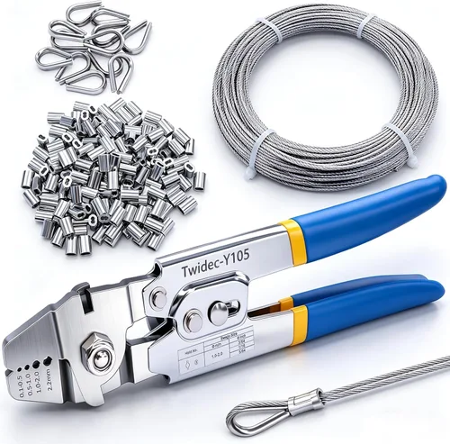 Herramienta de crimpado de cuerda de alambre de alta precisión está hecha de acero inoxidable resistente y robusto. Los dedales para cable de aviación y cuerda de alambre están hechos de aluminio y acero inoxidable 304, proporcionan máxima resistencia a la corrosión y excelente protección contra la superficie de la cuerda de alambre. Tiene 4 posiciones de crimpado: 0.1-0.5 mm, 0.5-1.0 mm, 1.0-2.0 mm, 2.2 mm. Puede crimpar fácilmente mangas y más desde 50-450 lb de línea de prueba Con agarres antideslizantes y diseño de mecanismo de autobloqueo, hace que sea más fácil cortar cables con precisión. Este modelo viene con un agarre antideslizante y un bloqueo de seguridad. La herramienta de crimpado coordinada con la virola del barril se puede utilizar ampliamente para barandillas, correas de perro, tendederos, mangas de crimpado para pesca, colgar cuadros u otros engranajes marinos e industriales y redes de protección Los productos incluyen 1 pieza de herramienta de crimpado de cuerda de alambre, 160 piezas de virolas de doble barril de 1/16 pulg, 12 piezas de dedales de cuerda de alambre de 1/16 pulg, 20 metros de cable de aeronave de 1/16 pulg