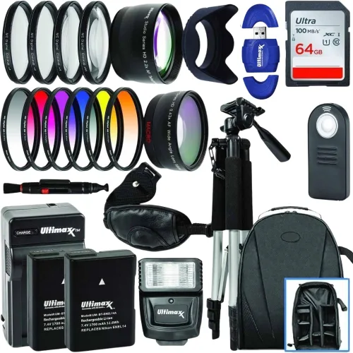 Kit de fotografía versátil: este conjunto incluye una variedad de accesorios para ampliar las capacidades de su cámara. Con lentes macro y filtros de color, proporciona herramientas para la fotografía creativa y diversa. Adecuado tanto para principiantes como para usuarios avanzados que buscan mejorar su equipo. Fuente de alimentación portátil: incluye dos baterías recargables EN-EL14A y un cargador de viaje rápido para una alimentación confiable dondequiera que vaya. Mantenga su cámara encendida para sesiones de disparo más largas sin interrupciones. Ideal para viajes, eventos o fotografía sobre la marcha. Almacenamiento de alta velocidad: la tarjeta de memoria SanDisk Ultra 64GB SDXC ofrece un amplio almacenamiento con una rápida transferencia de datos. Está diseñado para soportar archivos de fotos grandes y grabaciones de video de manera eficiente. Capture más contenido sin cambiar con frecuencia las tarjetas de memoria. Soporte de cámara resistente: el kit viene con un trípode de 57" y un monopie de 72" para estabilizar tus disparos. Un flash externo añade iluminación adicional para mejorar la calidad de imagen en entornos más oscuros. Logra fotos estables y bien iluminadas en varios entornos de disparo.