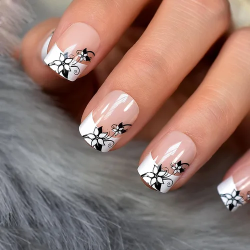 Uñas postizas a presión, uñas postizas blancas naturales con diseño de flores negras francesas, pegamento de gel UV y uñas postizas reutilizables con large