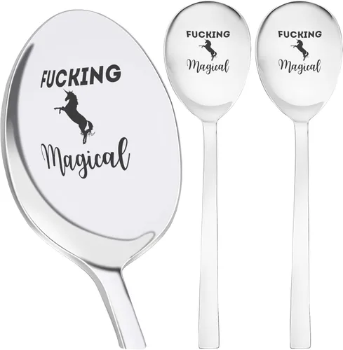 Paquete de 3 cucharas: cuchara de cubiertos altamente duradera y moderna para uso diario. Las cucharas están grabadas con máquinas de grabado láser de alta calidad. Esta cuchara de café está hecha de acero inoxidable de alta calidad. Los bordes de la cuchara para amantes del café son redondeados Perfecto para el amante del café en tu vida. Esta cuchara de café está hecha de acero inoxidable, es resistente y duradera. ¡Cuchara de café única! La cuchara de café de alta calidad es ideal para el uso diario, como cucharas para café o té, helado, servir sopa, cucharadita, cucharada y para cereales, cenas o aperitivos o como regalo para amigas o hermanas que se están mudando, para los amantes del café o el té para expresar tu amor y cuidado, estas cucharas con mensajes serán bienvenidas unicornio fvcking mágico divertido dicho Unicorn Fvcking Magic Funny Saying - Cuchara de acero inoxidable | Paquete de 3 Cuchara de 8 pulgadas - 8.3 in, paquete de 3. Grabado láser: esta cuchara de soupe altamente duradera y moderna está grabada con máquinas de grabado láser de alta calidad. Las impresiones duran para siempre incluso después de múltiples lavados.