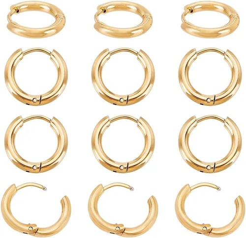Pendientes Huggie: estos aros de aretes tienen forma de anillo, aretes exquisitos y únicos, que chocan con diferentes prendas para crear diferentes chispas. Cantidad: 24 aretes de aro en el paquete, tamaño de aproximadamente 0.551 in de ancho, 0.571 in de largo, 0.098 in de grosor (calibre 10), pin: 0.039 in. Material hipoalergénico: estos aretes de aro están hechos de acero inoxidable de alta calidad, perfectos para la fabricación de joyas y aretes de bricolaje, y no tienes que preocuparte por sus problemas de calidad. Aretes de aro: los aretes de aro dorados son delicados y simples, buenos para la mayoría de los principiantes, muchos pasatiempos creativos y aretes personalizados. Bonitos aretes: atrapa la luz y añade diversidad de textura a tu look. Para hombres y mujeres, estos podrían ser una buena adición a tus joyas de oreja sin sobrecargar tu aspecto con demasiados detalles.