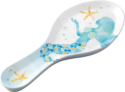 Patrón caprichoso de sirena y estrella de mar: el soporte para cucharas muestra un diseño caprichoso y encantador con una sirena rodeada de estrellas de mar, añadiendo un toque de magia y maravilla a su cocina. Material de melamina duradero: hecho de melamina 100% de alta calidad, 100% libre de BPA y seguro para el uso alimentario, esta vajilla garantiza durabilidad y resistencia a la rotura, por lo que es adecuada para uso en interiores y exteriores. Tamaño generoso: mide 9 5/8 pulgadas de largo, 4 pulgadas de ancho y 3/4 pulgadas de altura, este soporte para cucharas proporciona un amplio espacio para acomodar una variedad de utensilios, incluyendo cucharas, espátulas y cucharones, manteniendo tus encimeras limpias y organizadas. Fácil de limpiar y apto para lavavajillas: la superficie lisa del soporte para cucharas de melamina es fácil de limpiar. Simplemente límpialo con un paño húmedo o enjuágalo con agua corriente para un mantenimiento rápido y cómodo. Además, es apto para lavavajillas, lo que hace que cleanUP sea aún más fácil. Versátil y multiusos: este soporte para cucharas puede ser versátil y tiene múltiples usos más allá de solo sostener una cuchara. Por ejemplo, se puede utilizar como un plato pequeño para servir aperitivos o aperitivos, como aceitunas o nueces. Su diseño poco profundo lo hace adecuado para guardar pequeños alimentos y también puede añadir un toque decorativo a la presentación del plato.