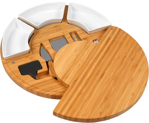 Vaiyer Juego de tablas de cortar de queso charcutería con tabla de queso redonda de 13 pulgadas con 3 cuchillos, 3 cuencos de cerámica con 2