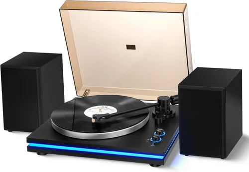 [Sistema de Sonido de Grado Profesional con Componentes Premium] Experimenta la calidez auténtica del vinilo a través del cartucho AT-3600L de alto rendimiento y el lápiz óptico de diamante, que lee suavemente cada surco mientras protege tus discos. El plato giratorio accionado por correa y el plato de aluminio pesado trabajan juntos para reducir la vibración, ofreciendo un sonido puro y estable desde la fuente. [Sonido estéreo inmersivo de 20 W x 2, sintonizado por expertos] Los altavoces independientes duales de 20 W proporcionan un audio rico que llena la habitación con graves equilibrados y agudos nítidos. Cada componente ha sido refinado acústicamente por ingenieros de sonido profesionales con más de 40 años de experiencia, asegurando una experiencia auditiva potente y matizada. 【Iluminación elegante y diseño práctico】 Una sutil tira LED de color azul frío envuelve el tocadiscos, añadiendo un toque moderno a cualquier estilo de decoración. La elegante cubierta antipolvo teñida de ámbar no solo mejora su aspecto retro, sino que también protege contra el polvo, fusionando la estética minimalista con la comodidad diaria. [Conectividad Bluetooth 5.4 sin problemas] Transmite fácilmente música desde tu teléfono, tableta o portátil utilizando la última tecnología Bluetooth 5.4. Con soporte para múltiples opciones de entrada, incluyendo AUX y RCA, este tocadiscos se adapta a tu estilo de vida, ya sea que estés reproduciendo vinilos o transmitiendo música digitalmente. Un regalo reflexivo para amantes de la música y estilistas por igual: Diseñado tanto para entusiastas del vintage como para interiores modernos, este tocadiscos equilibra forma y función con elegancia atemporal. Es un regalo inolvidable, para un ser querido o para ti mismo, celebrando la pasión por la música y la vida refinada.
