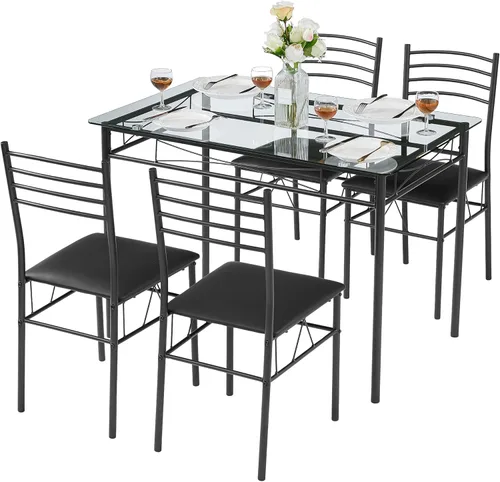 Juego de mesa de comedor de 5 piezas: este juego de mesa de comedor incluye una mesa de comedor y 4 sillas de comedor tapizadas. El aspecto de cristal y el elegante marco de metal lo convierten en un complemento versátil para cualquier cocina o comedor, actuando como un punto central en la decoración de tu hogar. Resistente y duradera: hecha de una mesa de vidrio compuesto y un marco de metal, esta mesa y sillas de cocina para 4 están diseñadas para proporcionar una larga durabilidad. Además, el estilo de mesa de vidrio grueso es resistente al desgaste y al agua, fácil de limpiar, se puede colocar en cualquier comida o bebida. Cojín tapizado mejorado: nuestras 4 sillas de comedor están acabadas con material de cuero duradero. El cojín suave está envuelto con esponja de alta densidad, que tiene buena resistencia, lo que te ofrece una mejor experiencia de asiento. El respaldo alto está diseñado ergonómicamente para proteger tu espalda, lo que te hace más cómodo cuando te inclinas hacia atrás. Diseño que ahorra espacio: el juego de mesa de comedor es lo suficientemente espacioso como para proporcionar un cómodo espacio para comidas para 4 personas. Diseñadas pensando en la practicidad, las sillas se deslizan perfectamente debajo de la mesa para un almacenamiento eficiente y ahorro de espacio. Fácil de montar: la estructura simple hace que sea fácil de montar. Incluye todas las piezas, instrucciones y herramientas necesarias para un montaje sin problemas.