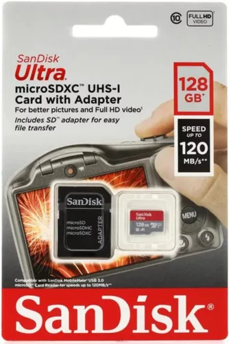 Hasta 128 GB para almacenar aún más horas de video Full HD (1 GB = 1.000.000.000 bytes) Las velocidades de transferencia de hasta 120 MB/s te permiten mover hasta 1000 fotos en un minuto Almacena de forma segura todas tus fotos, archivos, música y más Cargue aplicaciones más rápido con rendimiento A1. El rendimiento A1 es 1500 IOPS de lectura, 500 IOPS de escritura. Basado en pruebas internas. Los resultados pueden variar según el dispositivo anfitrión, el tipo de aplicación y otros factores. Compacto y duradero