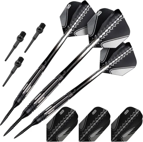 Los dardos de conversión vienen con un juego de puntas de acero convertidor y puntas suaves, lo que los hace utilizables con dianas de sisal y electrónicas Los barriles de tungsteno del 90% tienen un perfil delgado para agrupaciones de tiro apretado Los vuelos de flujo estándar y delgados de 100 micras están diseñados por expertos para un máximo control y te permiten personalizar tus dardos para adaptarse a tu lanzamiento Incluye tres dardos, puntos convertidores, puntas suaves, juntas tóricas y un total de seis vuelos en tamaños delgados y estándar