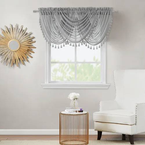 Vision Home Cortina de cascada semitransparente gris plateado con adornos de borlas decorativas, mezcla de lino sólido, cortina para cocina,