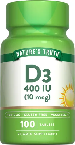 VITAMINA ESENCIAL D: Reciba 400 UI o 10 mcg de vitamina D (como colecalciferol D3) por porción. TABLETAS VEGETARIANAS: Las tabletas fáciles de tomar proporcionan una excelente fuente de vitamina D. Honesto y transparente: Nature's Truth se compromete a ofrecer productos de bienestar de la mejor calidad. EXPERTOS EN LOS QUE PUEDES CONFIAR: Respaldado por tres generaciones de innovadores de vitaminas para una calidad inigualable. Fabricado sin: gluten, trigo, levadura, leche, lactosa, soja, color artificial, sabor artificial, edulcorante artificial, conservantes y sin OMG.