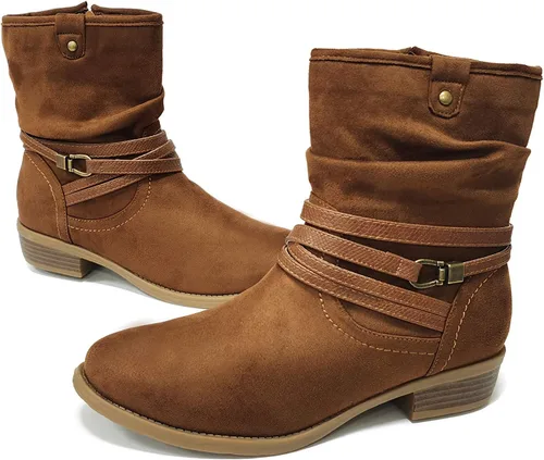 VJH confort Botas de media pantorrilla para mujer, puntera redonda, tacón bajo, cómodo, holgado, con correa de hebilla y cremallera lateral