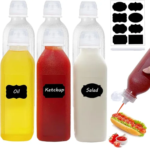 Material seguro: hecho de material de polipropileno de alta calidad de grado alimenticio, transparente y reciclable, libre de BPA. Lavable y reutilizable. Sellado, impermeable, ligero. Fácil de usar: cada botella de plástico vacía mide 2.5 x 8.8 pulgadas, boca ancha de 1-1/6 pulgadas, el cuerpo de la botella suave es fácil de exprimir la salsa, incluso con una mano, puedes abrir y cerrar fácilmente la tapa. Diseño a prueba de fugas: el cierre de tapa ajustado evita derrames y fugas, se puede quitar y poner fácilmente, las tapas están unidas a las tapas, por lo que no tienes que preocuparte por perderlas. Multiusos: perfecto para almacenar todas las salsas/líquidos: salsa, aceite de oliva, salsa de tomate, mostaza, mayonesa, salsa picante, salsa de soja, jarabe de arce, aderezo para ensaladas, etc. Perfecto para barbacoas, viajes de campamento y mucho más. El paquete contiene: 6 botellas de 16 onzas con 8 etiquetas de tiza, 1 bolígrafo. La escala digital clara es fácil de medir y observar la salsa.